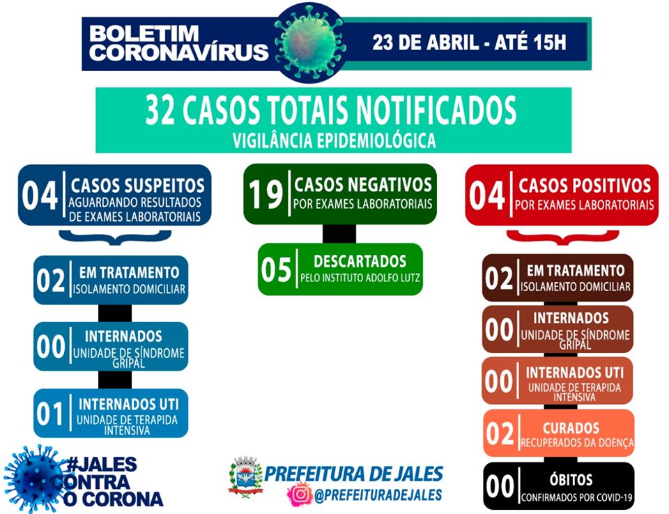 O terceiro caso positivo, notificado em Jales no dia 17/04, importado, teve alta da internação e retornou para a sua cidade de origem, onde permanece em isolamento domiciliar.