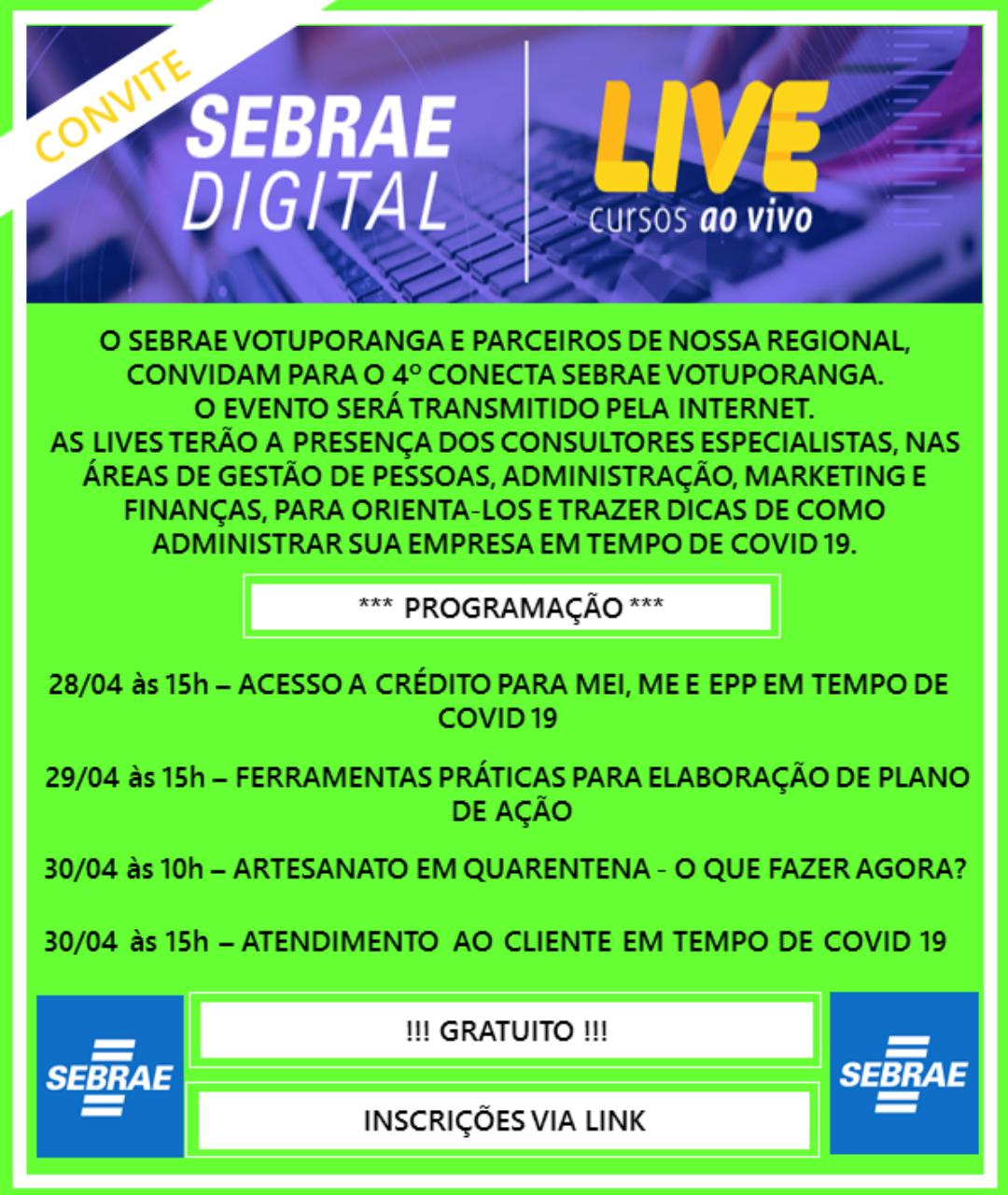As lives serão com consultores especialistas do Sebrae nas áreas marketing digital, finanças, jurídico e administração. As inscrições são feitas gratuitamente pela internet. (Inscreva-se clicando aqui).