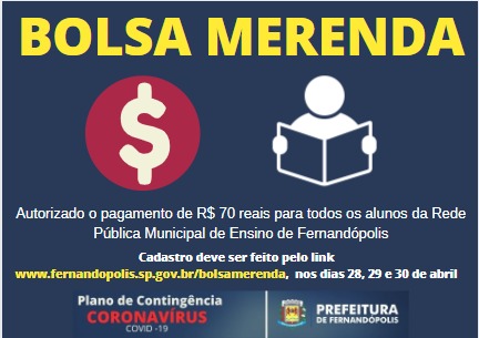 Como forma de auxiliar as crianças que perderam a merenda escolar devido à suspensão das aulas, a Prefeitura de Fernandópolis implanta o ‘Bolsa Merenda’, programa que será destinado a todos os alunos da rede pública municipal que manifestarem interesse no recebimento do benefício.