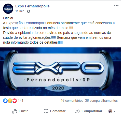 O perfil oficial da Expo Fernandópolis anunciou, instantes atrás, o cancelamento da festa deste ano. De acordo com a publicação, a festa está seguindo as normas de saúde para evitar o contágio pelo coronavírus.
