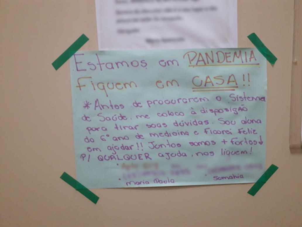 "Antes de procurarem o sistema de Saúde, me coloco à disposição para tirar suas dúvidas. Para qualquer ajuda, nos ligue!”. Foi assim que a estudante do sexto ano de Medicina, da Universidade Brasil, Maria Paula Modesto, de 24 anos, justificou sua iniciativa de colocar no elevador social do prédio onde mora, na região central de Fernandópolis, um comunicado disponibilizando-se a ajudar seus vizinhos idosos em caso de necessidade. O texto também salienta: “Estamos em Pandemia!”; “Fiquem em casa!”, referindo-se à necessidade de que, na hora de uma crise como a da covid-19, o que deve prevalecer é o espírito comunitário.