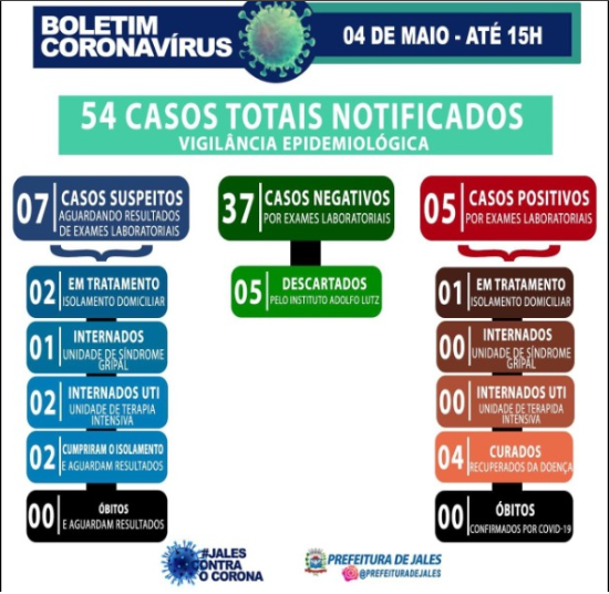 Foi divulgado hoje, 04, pela Secretaria Municipal de Saúde de Jales, o Boletim Epidemiológico informando que nas últimas 24 horas 04 exames testaram como negativos para Covid-19 na cidade. Dentre os exames, o de um homem de 77 anos que havia morrido com suspeita da doença na última sexta-feira, 01.