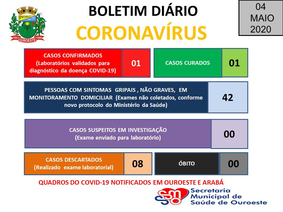 Ainda de acordo com o informativo, divulgado na noite desta segunda-feira, 4, não há nenhum casos suspeito de covid-19 no município.