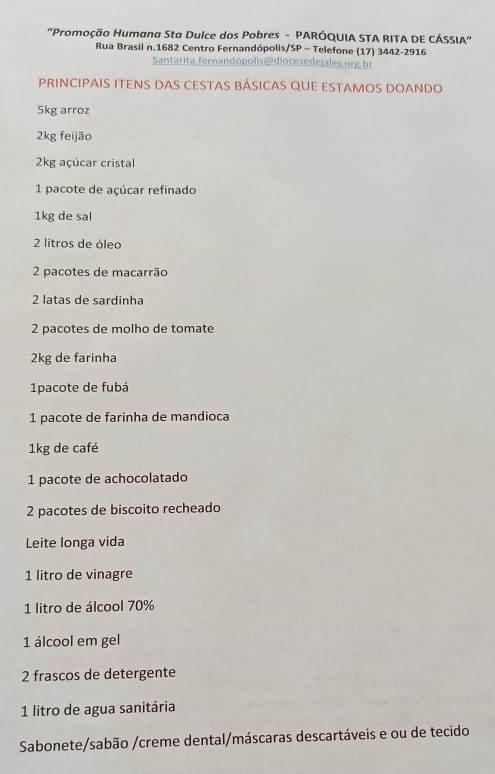 As doações – em espécie ou em alimentos -, podem ser entregues na Paróquia Santa Rita de Cássia ou na padaria Pão e Pão – localizada na avenida Manoel Marques Rosa, 1004, Centro.