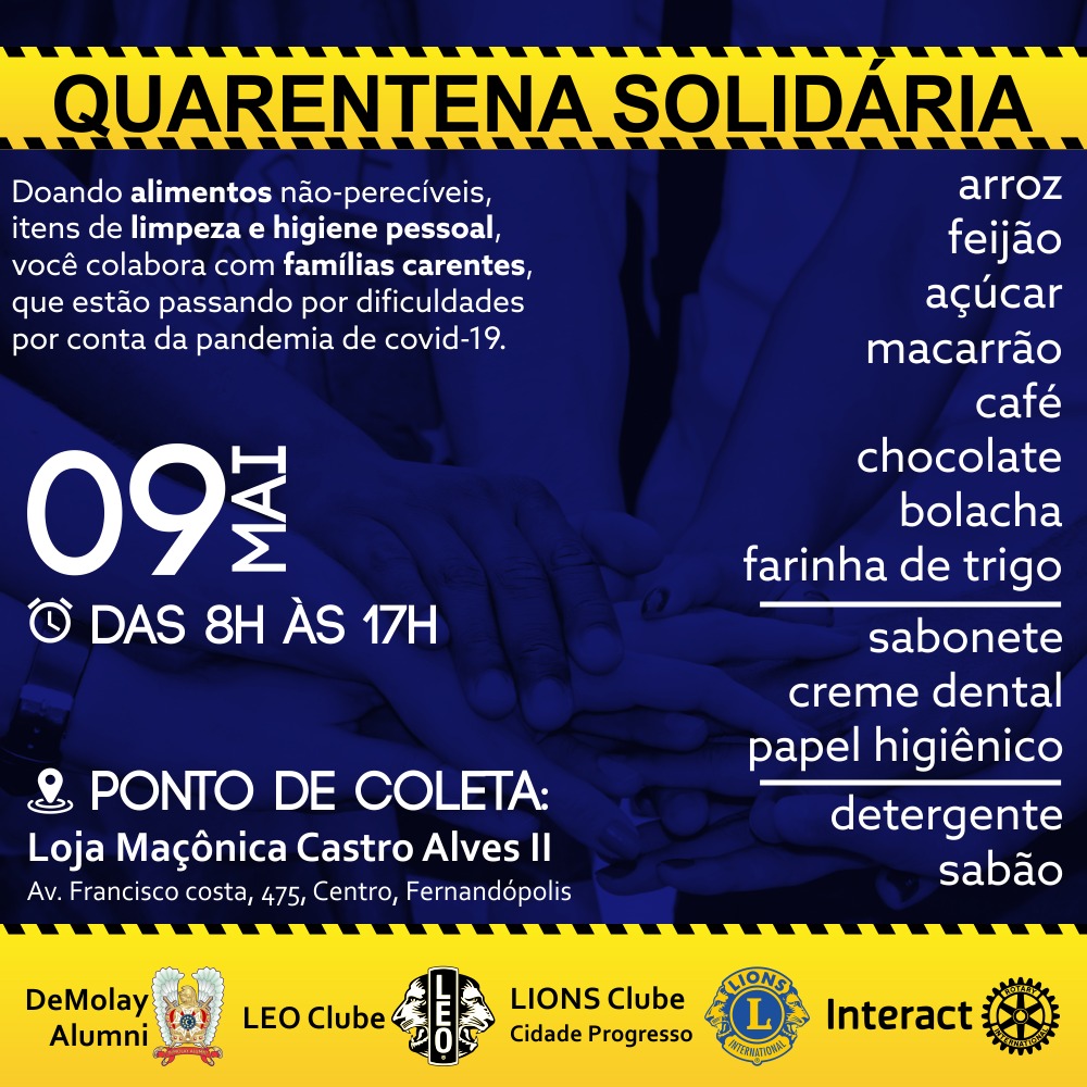 O Colégio DeMolay Alumnim, de Fernandópolis, realiza neste sábado, 9, a Quarentena Solidária. O projeto tem por objetivo arrecadar alimentos não perecíveis e produtos de higiene para distribuir à famílias carentes do município.