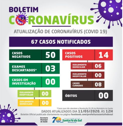 De acordo com Boletim Epidemiológico divulgado ontem, 11, pela prefeitura de Santa Fé do Sul, mais nenhum paciente está sendo investigado por suspeita de contaminação por Covid-19.
