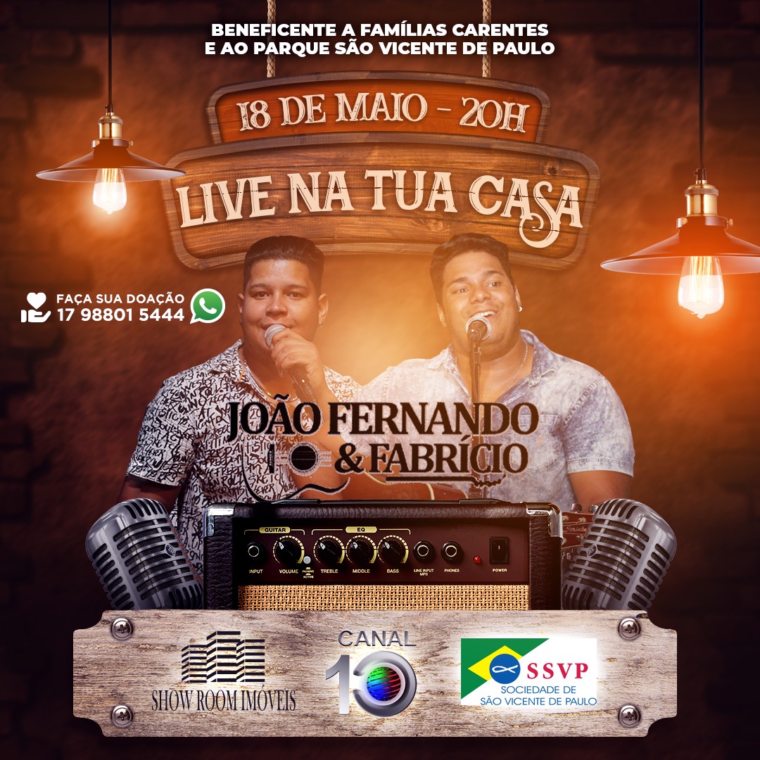Em tempos de pandemia, toda ajuda é bem vinda e necessária. Pensando nisso, a dupla sertaneja fernandopolense João Fernando e Fabrício anunciou que irá fazer uma live beneficente chamada “Live na tua casa” para arrecadar donativos.