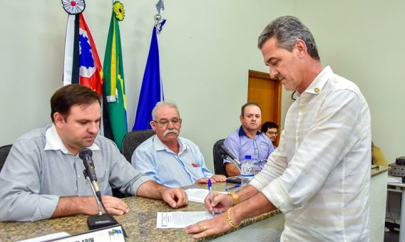 Prefeito Barão Lopes assinando documento durante sessão legislativa. Foto: Divulgação/Câmara Municipal de Estrela D´Oeste