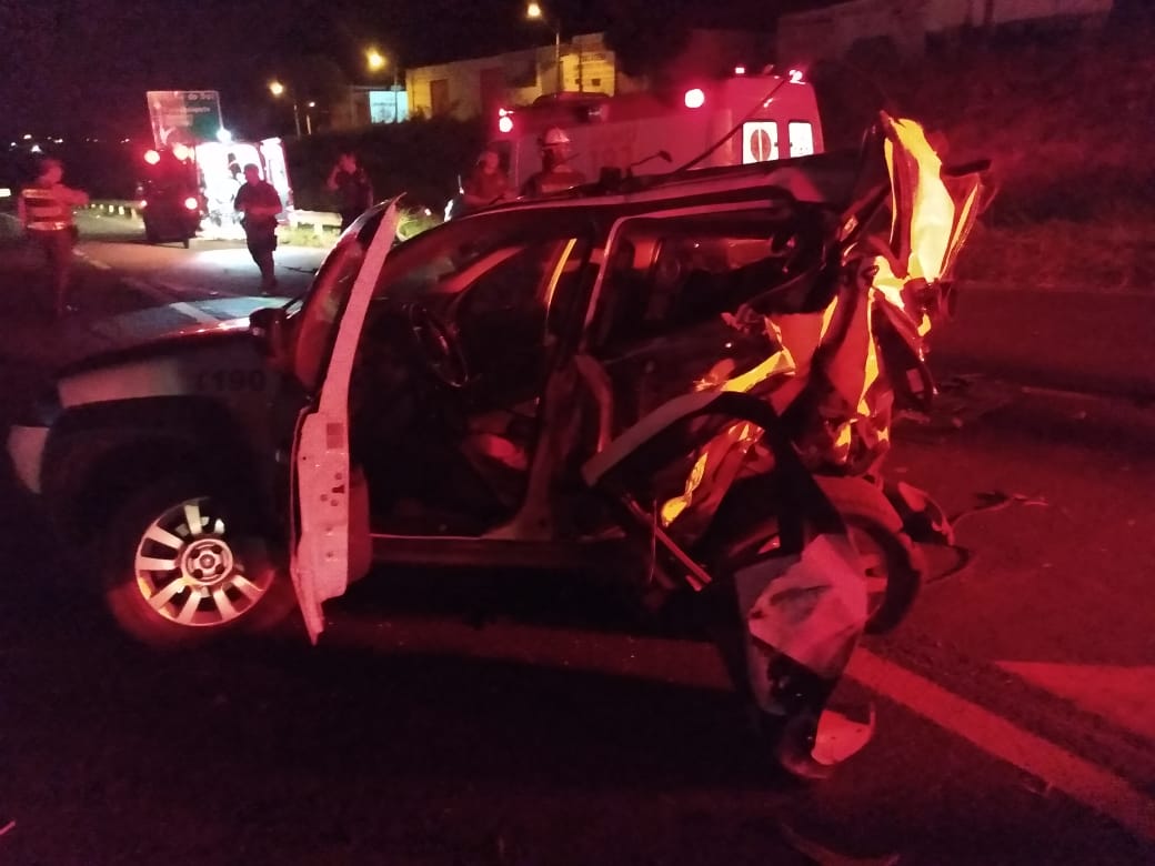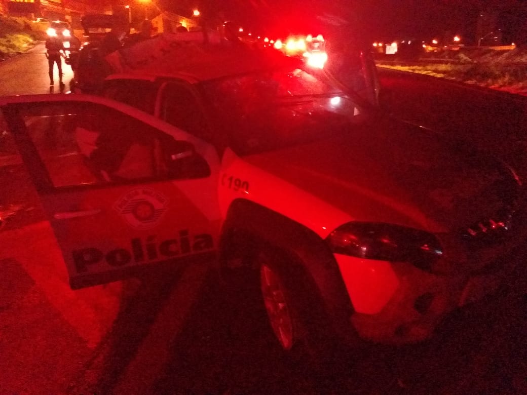 A viatura Fiat/Palio ocupada por dois policiais militares acabou sendo colidida com a VW/Amarok na rodovia Euclides da Cunha, no Jardim Araguaia, nesta madrugada. Segundo os policiais, a caminhonete trafegava em altíssima velocidade e após o choque, a viatura foi arrastada por cerca de 200 metros até cair na valeta existente no meio da pista próximo ao pontilhão da avenida Ângelo Del Grossi com a Duque de Caxias. A Amarok acabou parando na valeta lateral de escoamento de água.