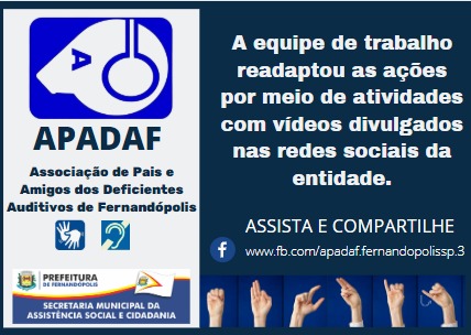 Em tempos de pandemia da Covid-19, a equipe de trabalho da APADAF- Associação de Pais e Amigos dos Deficientes Auditivos de Fernandópolis, em parceria com a Secretaria Municipal de Assistência Social e Cidadania, readaptou as ações por meio de atividades com vídeos divulgados nas redes sociais da entidade.