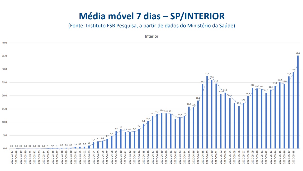 Um levantamento feito pelo Instituto FSB Pesquisa, com base em dados do Ministério da Saúde, mostrou que, até o dia 19 de maio, 16,7% das mortes registradas por covid-19 no Estado de São Paulo ocorreram no interior paulista.