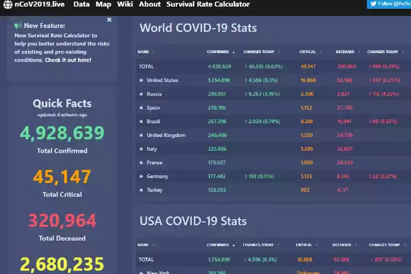 Site que monitora o novo coronavírus no mundo quase em tempo real. Foto: Reprodução