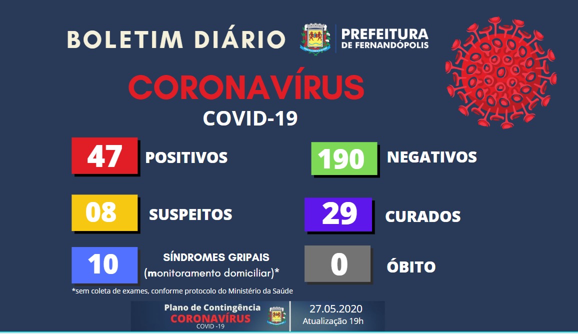 Fernandópolis registrou mais quatro casos de coronavírus e chegou aos 47, nesta quarta-feira, 27. Destes, 29 estão curados.