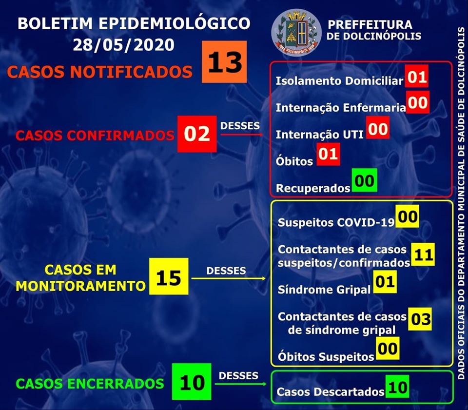 Atualmente foram notificados 13 pessoas, sendo 2 casos confirmados, 1 em isolamento domiciliar e 1 óbito.