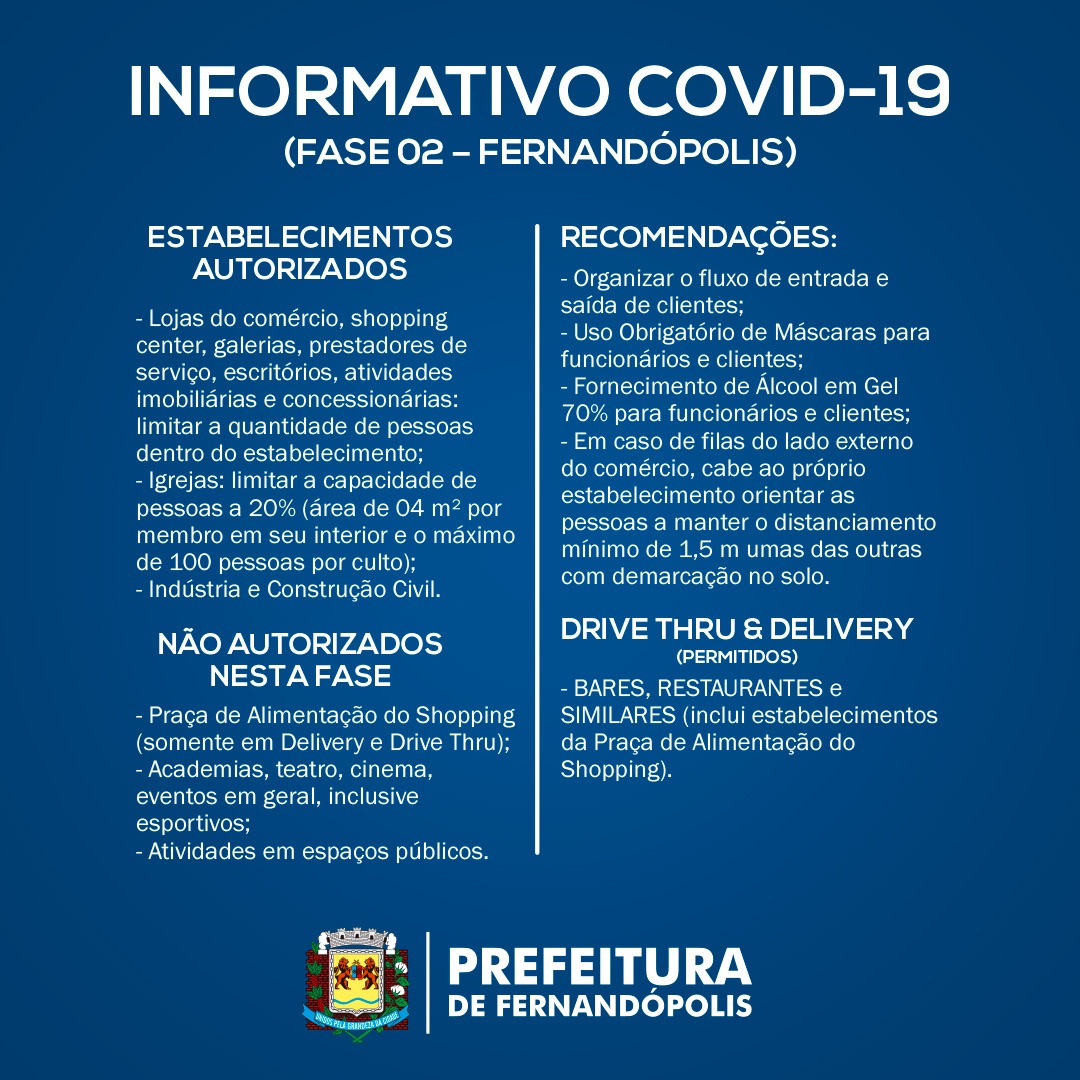 Os proprietários ou responsáveis por estabelecimentos comerciais deverão providenciar máscaras de proteção respiratória para todos os funcionários e proibir a entrada de clientes/consumidores que não estiverem usando máscaras de proteção. Número limitado de clientes no interior do estabelecimento; disponibilizando meios adequados para higienização das mãos, com álcool em gel, água e sabão. Filas internas organizadas, sendo observada a distância entre clientes/consumidores. O estabelecimento deverá ser constantemente higienizado, equipamentos, utensílios, superfícies e instalações. As regras serão monitoradas por todas as unidades e agentes de fiscalização da Prefeitura Municipal de Fernandópolis.