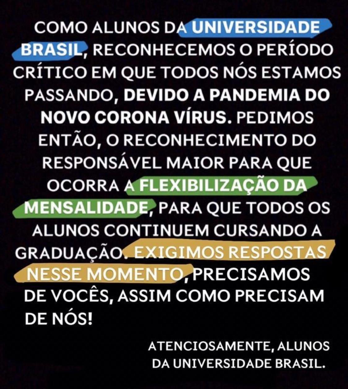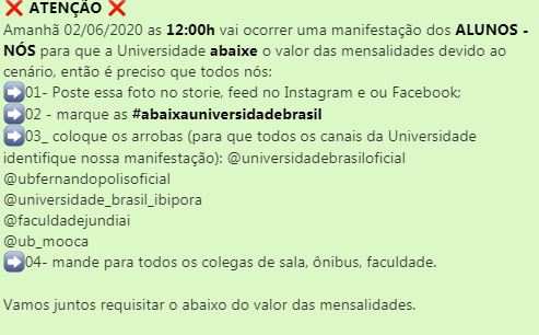 Manifestação será online e os alunos usarão a hashtag #abaixauniversidadebrasil