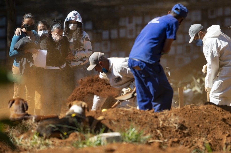 Corpo de Iziquiel Sampaio, vítima do coronavírus, é enterrado no cemitério da Vila Formosa, em São Paulo, nesta quinta-feira (28). — Foto: AP Photo/Andre Penner