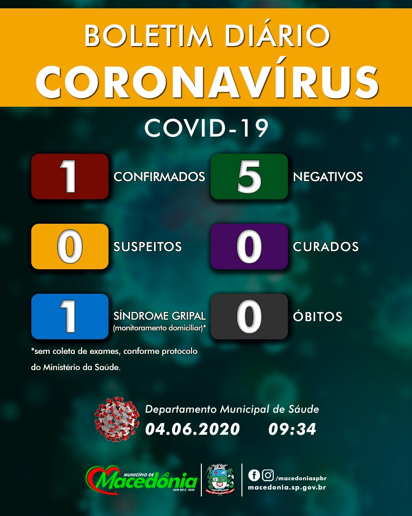 Macedônia registrou nesta quarta-feira, 3, o primeiro caso de coronavírus no município. A vítima é uma mulher, de 69 anos, que encontra-se internada na Santa Casa de Fernandópolis, com quadro clínico estável.