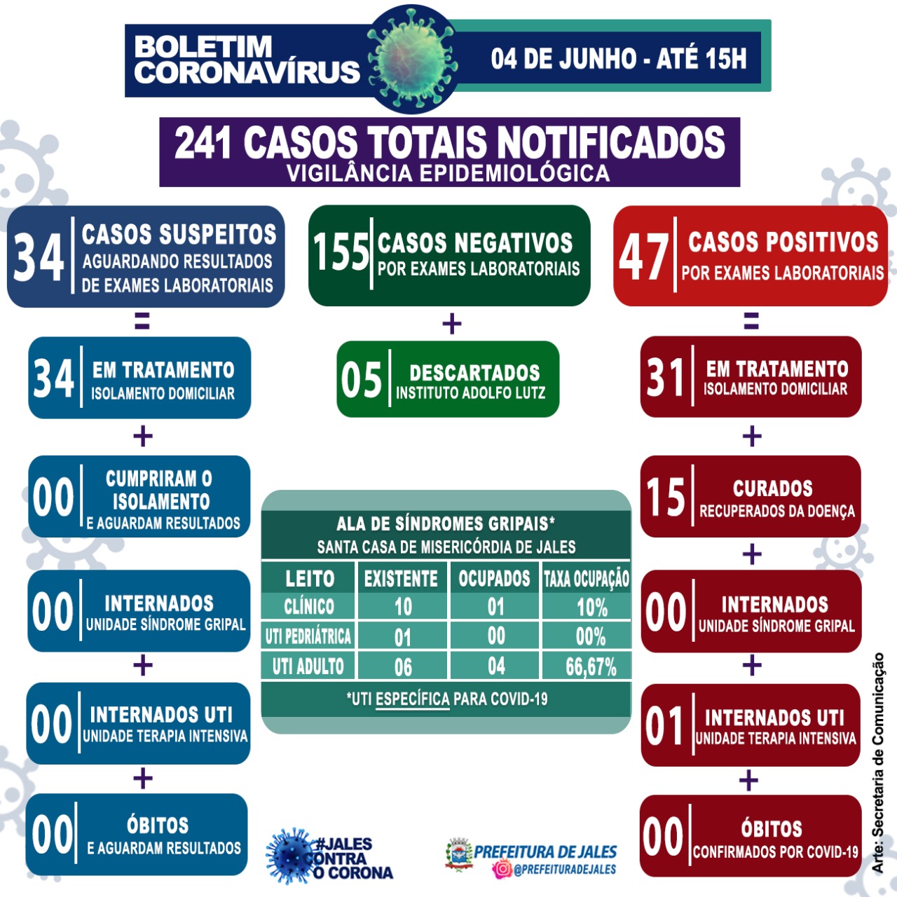 A Vigilância Epidemiológica de Jales registrou nesta quinta-feira, 4, mais seis resultados positivos para a Covid-19. Ainda foram registradas 17 novas notificações suspeitas e quatro exames negativos.