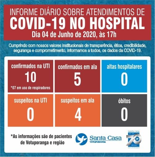 A UTI da Santa Casa de Votuporanga tem nesta quinta-feira, 4, 10 pessoas com coronavírus. Destas, sete estão utilizando respiradores.