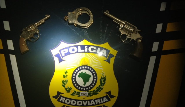 Duas armas de fogo foram apreendidas com os suspeitos. O motorista, de 25 anos, foi preso em flagrante por porte ilegal de arma de fogo e direção perigosa.