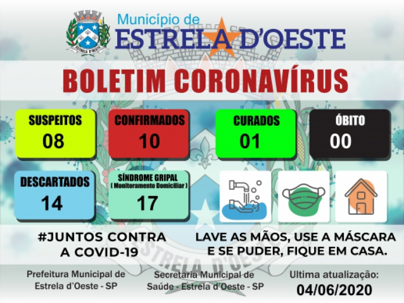 Através de boletim epidemiológico divulgado pela prefeitura de Estrela d´Oeste, foi confirmado que o município chegou ao numero de 10 casos positivos de Covid-19.