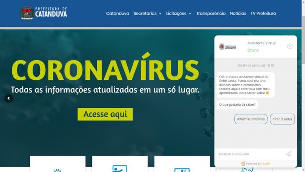 A Prefeitura de Catanduva (SP) lançou uma plataforma de inteligência artificial responsável por fazer a triagem e o acompanhamento online de pacientes com suspeita de coronavírus.