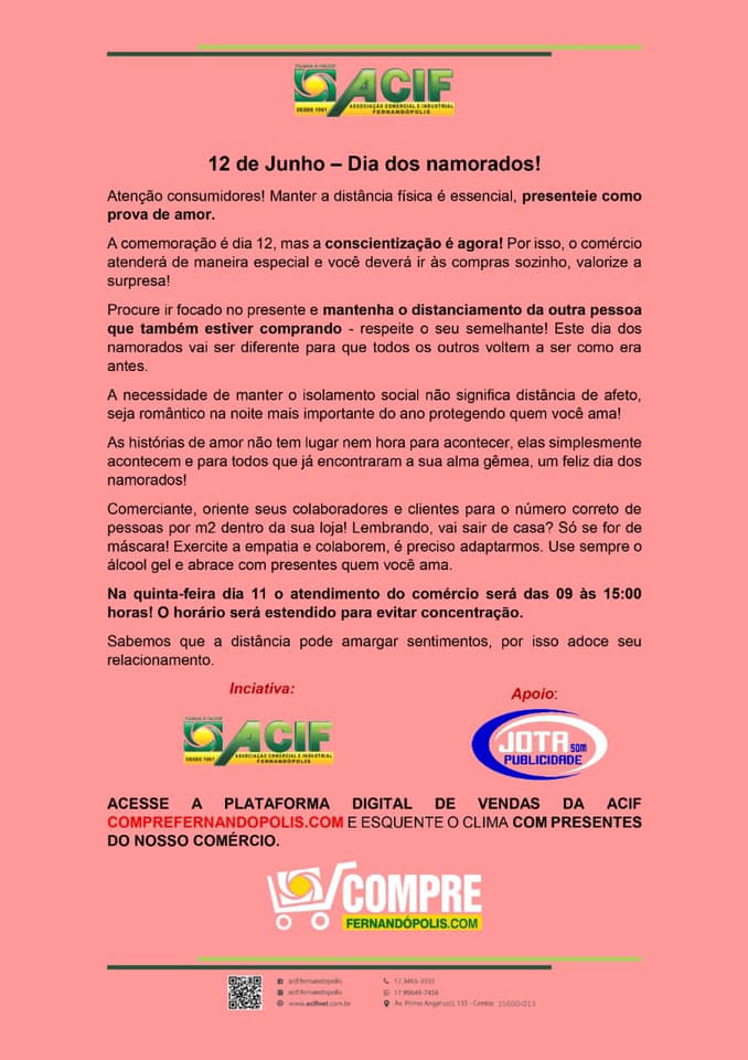 Nesta segunda-feira, dia 8, a Acif (Associação Comercial e Industrial de Fernandópolis) publicou, nas redes sociais, comunicado para anunciar que o comércio de Fernandópolis vai funcionar em horário especial no feriado de quinta-feira (Corpus Christi) que antecede o Dia dos Namorados, comemorado no dia 12 de junho.