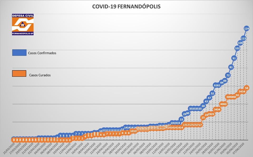Conforme dados divulgados pela Secretaria de Saúde a cada 9 dias os números de casos confirmados dobram na cidade. Se assim for, Fernandópolis terá 992 casos até dia 5 de julho.