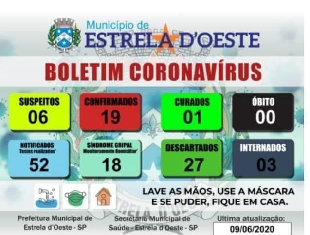 A Prefeitura de Estrela d'Oeste, município localizado a 16 quiolômetros de Fernandópolis, confirmou, por meio de um boletim epidemiológico, que foram registrados 19 casos positivos de coronavírus (covid-19).