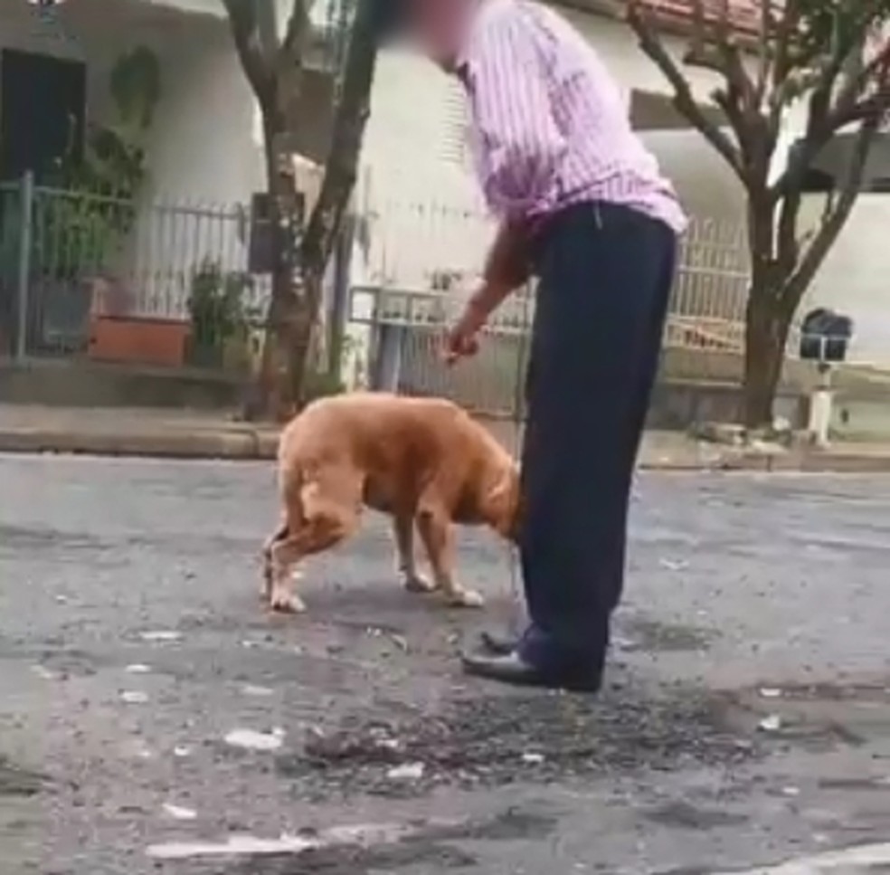 Cachorro é agredido com corda e puxado por idoso no meio da rua