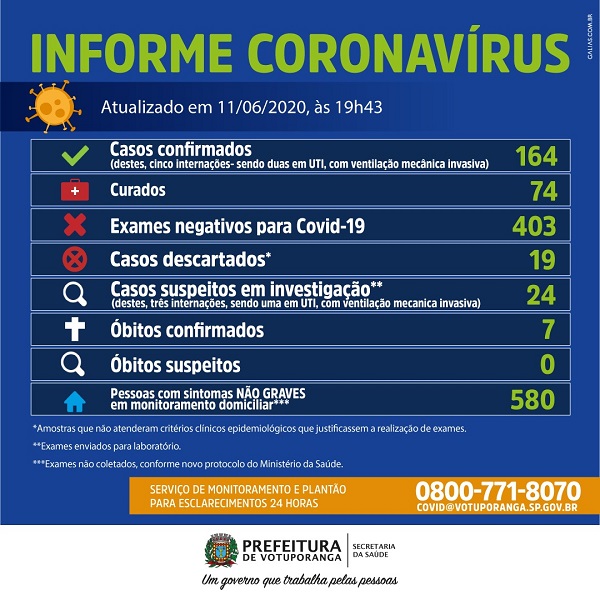 Com os casos de hoje o município chegou em 164 no total, com sete óbitos.