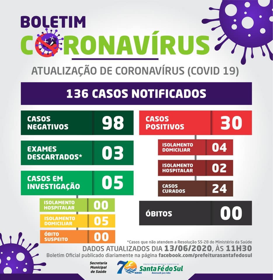 O novo boletim epidemiológico de coronavírus em Santa Fé do Sul registrou, neste sábado, 13, que apenas seis pacientes seguem em tratamento, quatro em suas casas e dois na Santa Casa local. Outros 24 já contraíram o vírus e foram curados. Não há registro de óbito por Covid-19 na cidade.