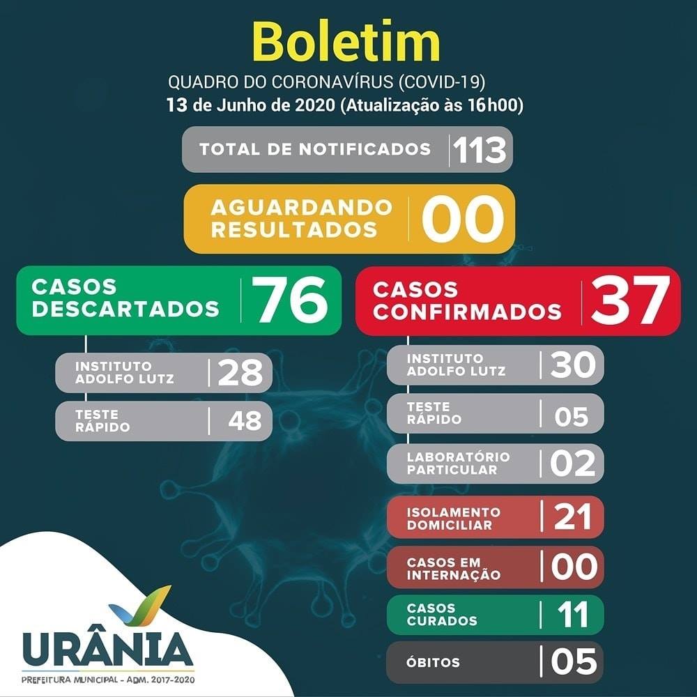 Em Urânia foram registrados cinco mortes e 37 casos confirmados de Covid-19 no município. Desse total, 11 casos curados, 21 em isolamento domiciliar e nenhum paciente internado na Santa Casa de Jales.