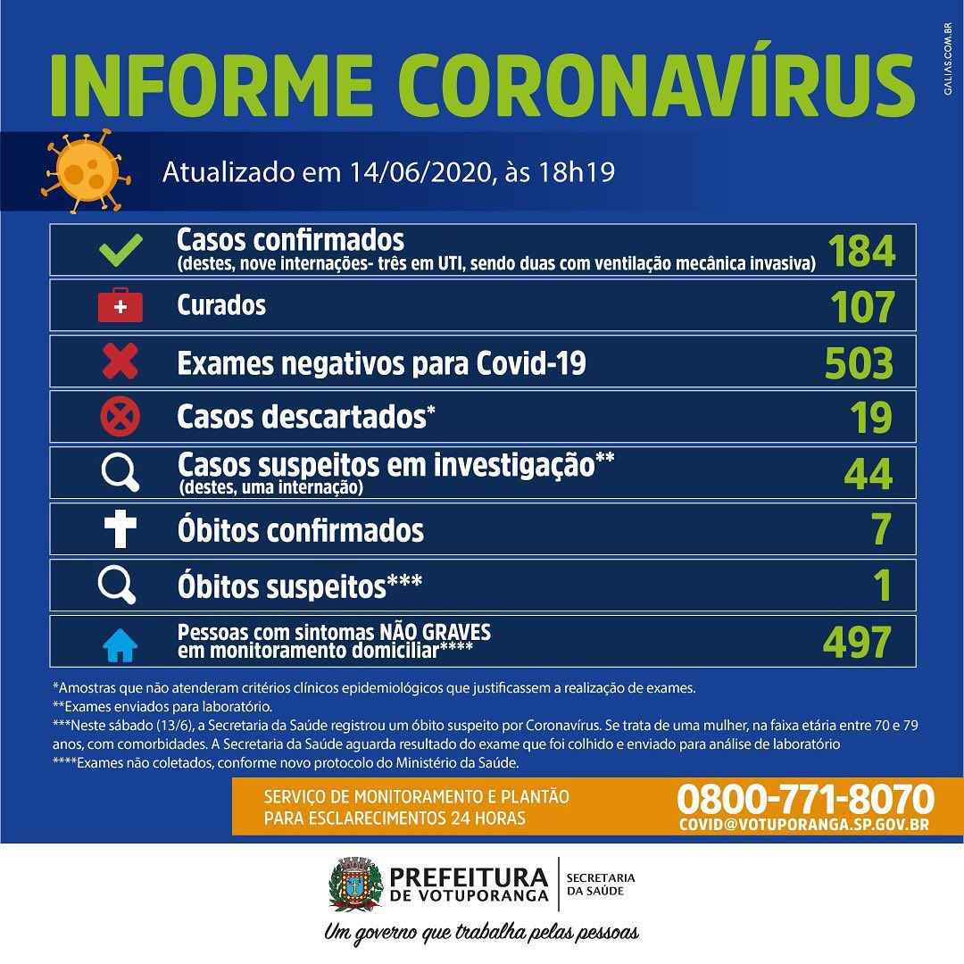 Com os casos de hoje o município chegou em 184 no total, com sete óbitos confirmados e um suspeito.
