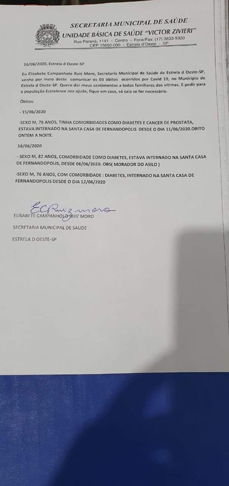 Documento emitido pela Secretaria de Saúde de Estrela d'Oeste confirmando as mortes por Covid-19