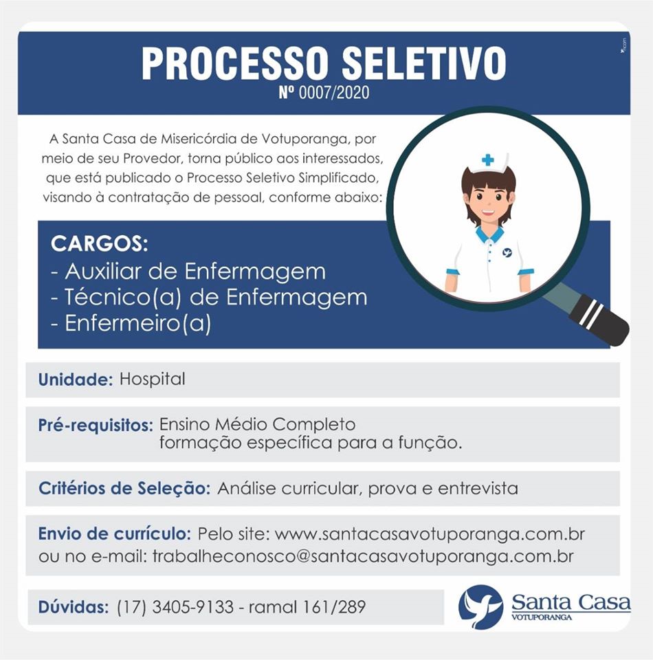 A Santa Casa de Votuporanga abriu processo seletivo. As vagas são para enfermeiro, auxiliar ou técnico de enfermagem, e exigem ensino médio completo, além formação especifica na função.