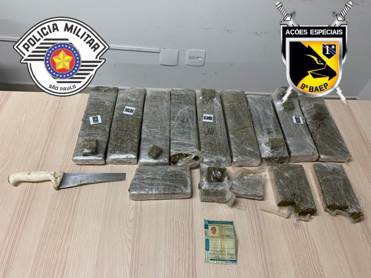 Em seu quarto, foi encontrada uma caixa com 14 tijolos de maconha e uma faca utilizada para cortar a droga. O rapaz explicou que adquiriu os entorpecentes após receber o acerto trabalhista e pretendia vende-la.