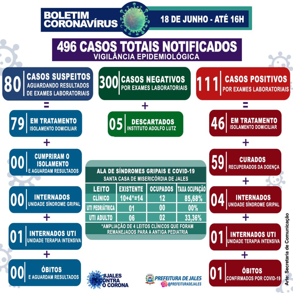 Na Ala de Síndrome Gripal da Santa Casa de Jales, específica para tratamento da Covid-19,o número de leitos ocupados por pacientes de Jales e da região, nas últimas 24 horas são: