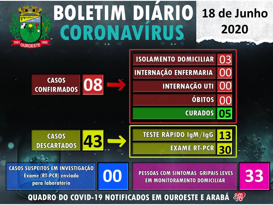 A Secretaria da Saúde de de Ouroeste divulgou novo Boletim diário sobre notificações do Coronavírus em Ouroeste, até às 18:00 do dia 18/06/2020.