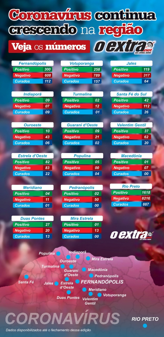 Fernandópolis confirmou nesta sexta-feira, 19, mais 23 casos da doença, na comparação com quinta, chegando aos 300 infectados. Destes, 112 estão curados da doença. O último boletim ainda informa que são 608 testes negativos e 49 pacientes tratados como suspeitos. Em um dia dessa semana o município chegou a ter 31 casos confirmados.