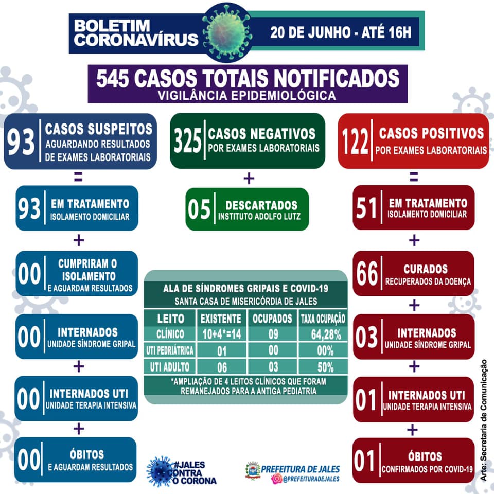 Na atualização deste sábado , 20 de junho, a Vigilância Epidemiológica de Jales teve a notificação de mais 14 casos suspeitos para a Covid-19 nas últimas 24 horas.