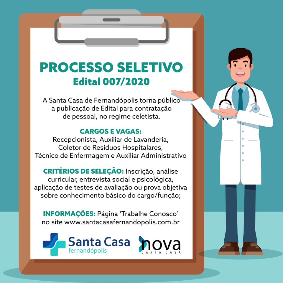 A Santa Casa de Fernandópolis divulgou na tarde de hoje, 23, que abriu Processo Seletivo para contratação de pessoal.