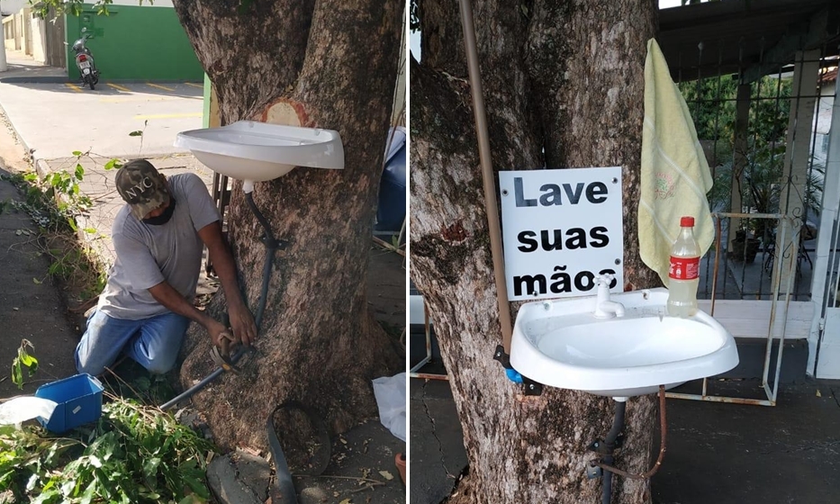 Homem improvisa pia comunitária para população lavar as mãos em Palmeira d'Oeste