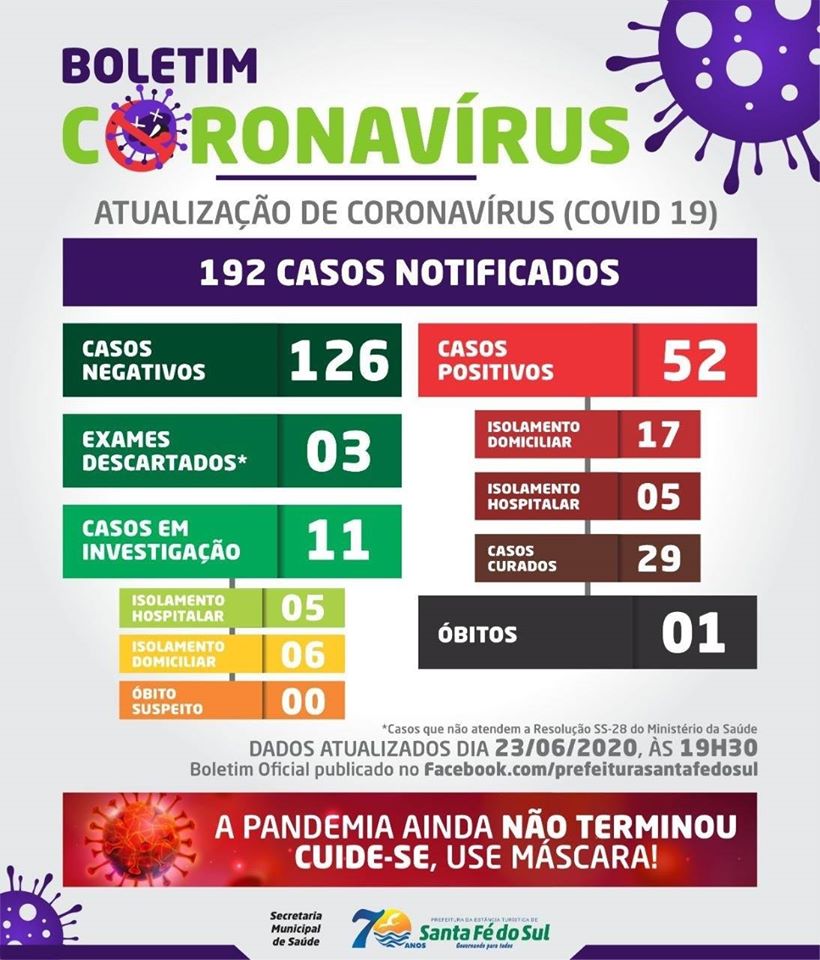 A Secretaria Municipal de Saúde da Estância Turística de Santa Fé do Sul, comunicou, nesta terça-feira, 23, o primeiro óbito de um paciente atestado como positivo para o novo coronavírus (Covid 19).