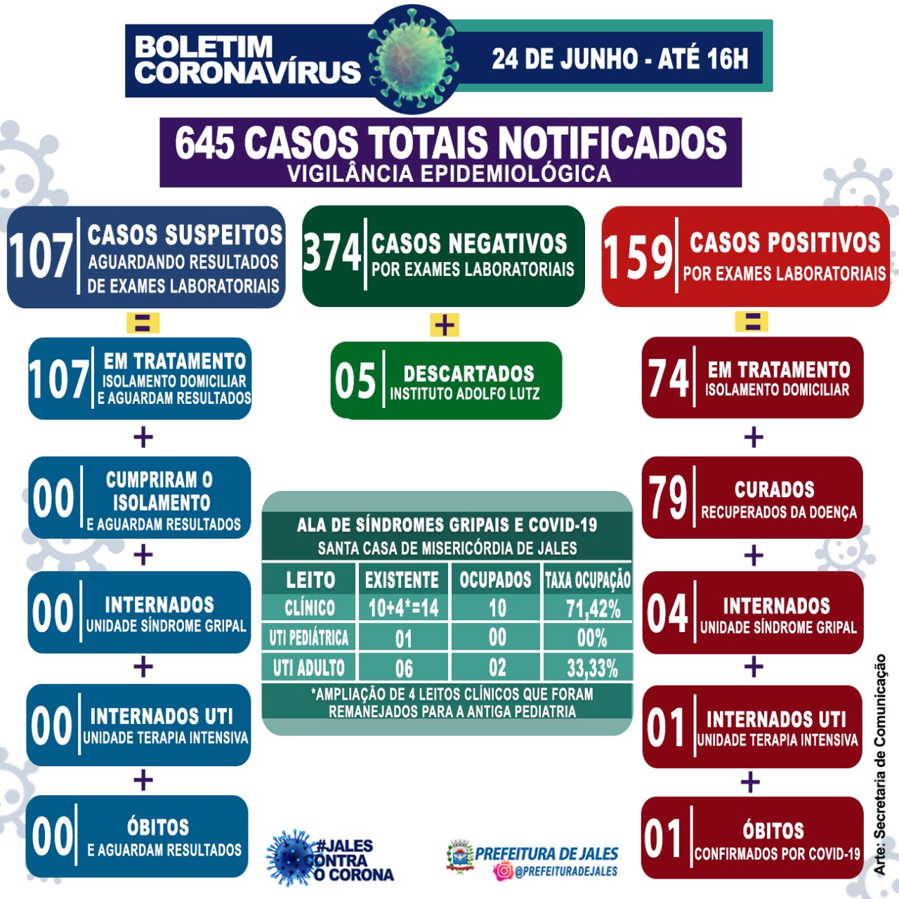 - Leito Clínico: 4 pacientes de Jales, 1 de Santana da Ponte Pensa, 1 de Santa Albertina, 1 de Urânia, 1 de Aparecida d’ Oeste, 1 Turmalina e 1 de Brasília.