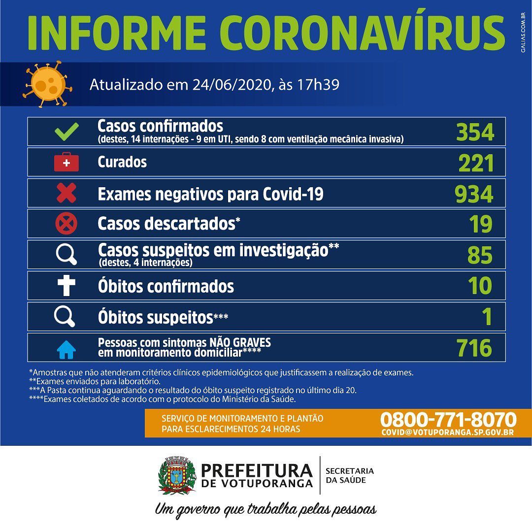 O município tem 354 casos confirmados, com 221 curados e 934 testes negativos.