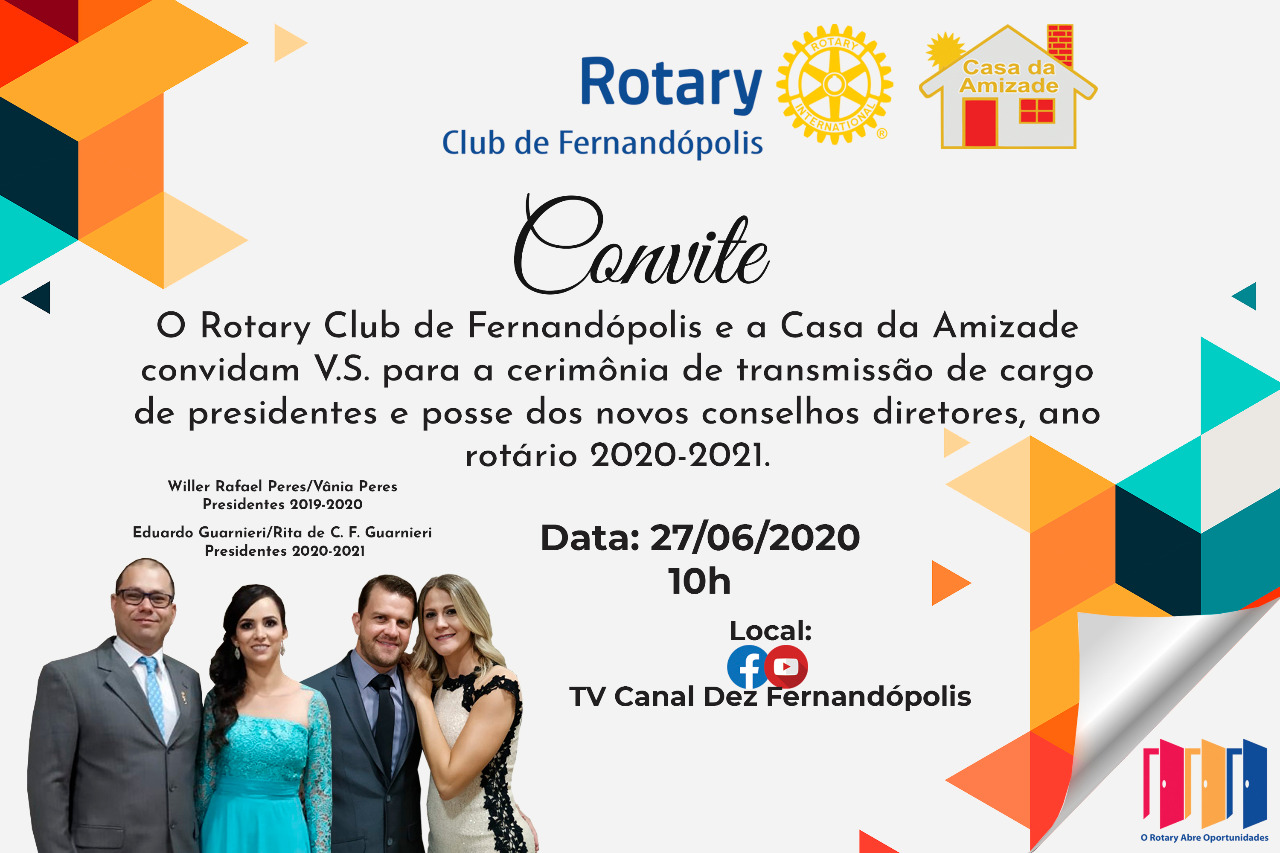 O Rotary Club de Fernandópolis e a Casa da Amizade, distrito 4480 realizam, neste sábado 27 de junho, a cerimônia de transmissão de cargo de presidentes e posse do novo conselho diretor para o ano rotário 2020-21.