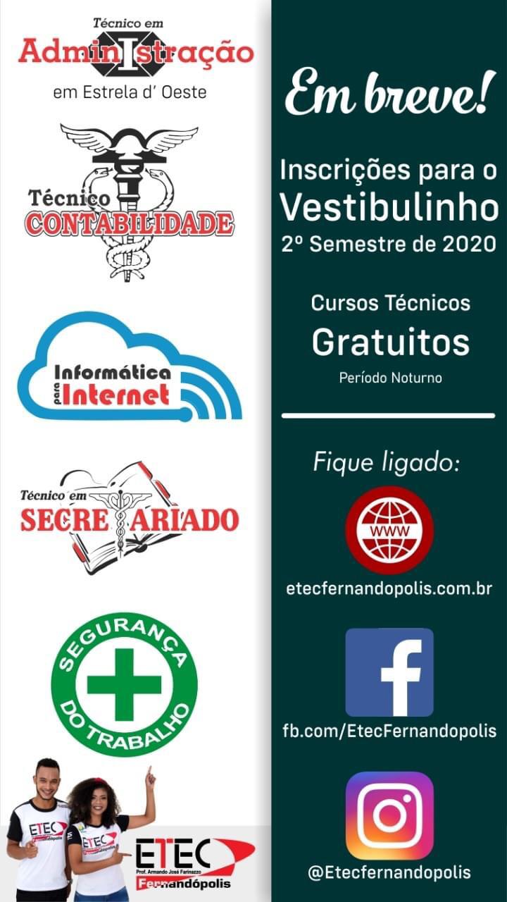 A ETEC Prof. Armando José Farinazzo, de Fernandópolis, está com as inscrições abertas para o vestibular do 2° semestre de 2020. Os cursos gratuitos serão no período noturno:
