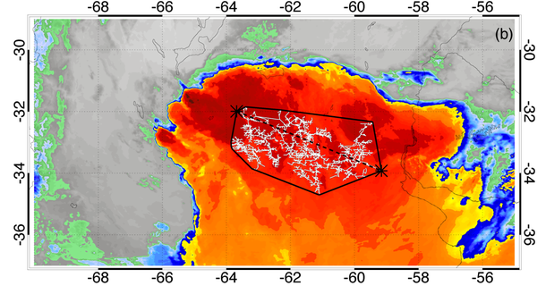 Imagem de satélite mostra o maior raio do mundo, em extensão: ele cortou o Sul do Brasil em outubro de 2018, percorrendo uma distância de 709 km. — Foto: Divulgação/OMM